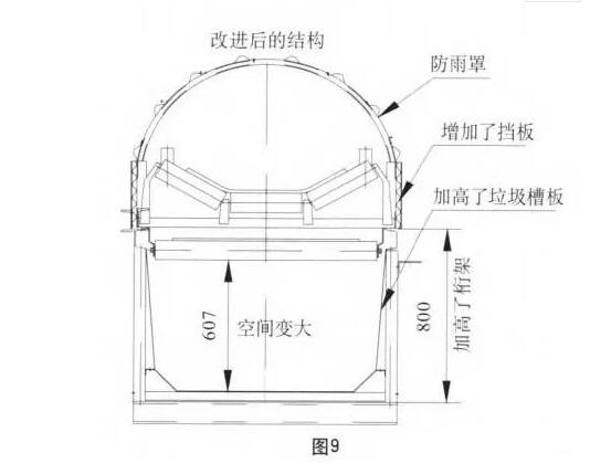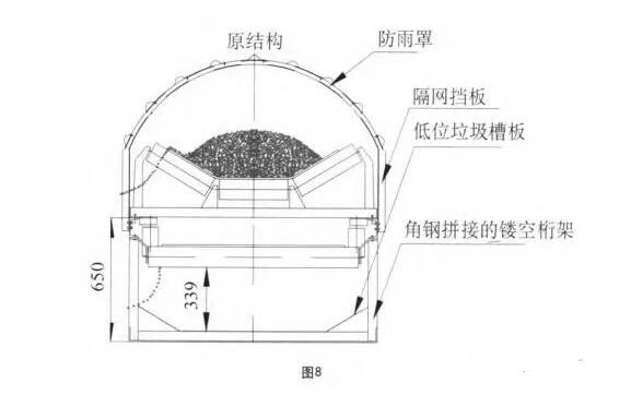 从图8原构造平面图中能够看得出,往返缓冲托辊与废弃物槽板中间的间隔仅有339mm。窄小的室内空间,必定会对将来平时的清除产生挺大的艰难。
