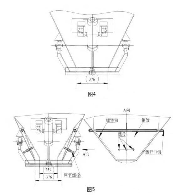 ②在转动门边框正下方,斗体板的两侧,焊接螺母,安裝调整地脚螺栓,并且用双螺帽避免松脱。当转动调整地脚螺栓时,推动门边框转动,进而祭出料口持续减少,做到降低总流量的目地。当总流量不够时,将调整地脚螺栓反方向转动,门边框在重量功效下,慢慢修复到与原进料口尺寸一样。