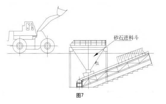 在拌和楼上住户料系统软件中,常常会遇到后场为单料桶送料方法,即根据一只沙石倒料送料,根据斜传动带传至沙石贮藏槽中。构造如图所示7图示: