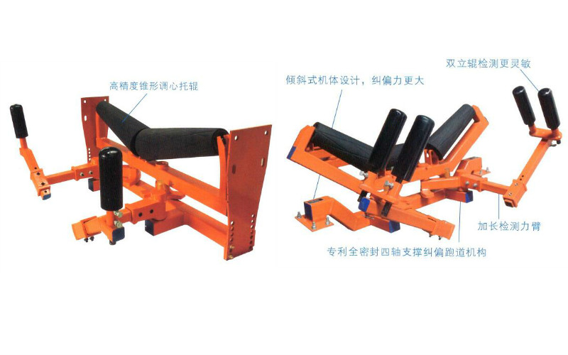机体采用倾斜式设计,当皮带向一侧跑偏时,托辊组水平方向会形成一个反方向纠偏角,同时此托辊组在纠偏的侧会垂直降低,形成多重纠偏力。对皮带的纠偏力度更大,纠偏效果更好。